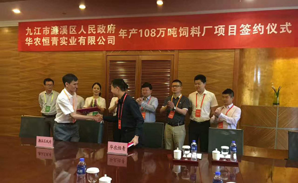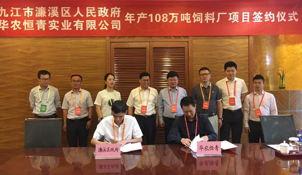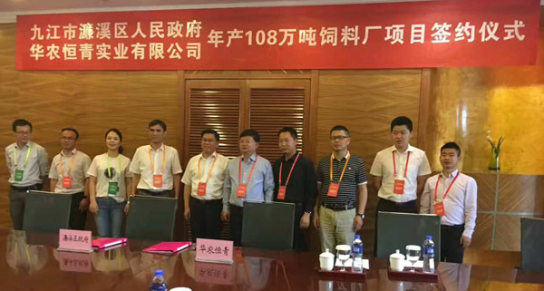 5月26日,首届长江经济带•九江新工业新动能投资洽谈会在江西九江成功召开,会议邀请了国家部委领导、省委常委、常务副省长毛伟明、沿长江流域24城市市领导及企业有关人士,共计800多人参会。在会上对引进的重点投资项目进行了集中签约,华农恒青作为重点投资项目之一,年产108万吨高档饲料项目成功签约,正式落户江西省九江市濂溪区,项目将分三期工程建设完成。公司李旭荣董事长及公司部分主管参加了签约仪式,濂溪区委书记柯尊玉、濂溪区政府党组成员、区政协副主席张家金、区商务局局长李玉芬等领导参加了现场签约仪式,共同见证华农恒青年产108万吨饲料项目,正式落户长江经济带重要节点城市——九江。