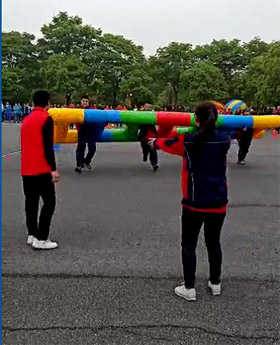 下午举行的毛毛虫竞技、极限旋转、鸿运彩球中,同样是2边各3名男队员加1名女队员进行50米的接力比赛,如中途有违规、失误的队伍需要加时5秒,由裁判员全程跟踪计时。在毛毛虫竞技比赛中,为了保证毛毛虫可以迅速稳定的到达终点,四位队员之间不仅要左右迈步一致、还要兼顾队员之间步伐的大小不一样,否则的话毛毛虫前进的速度会变慢,步伐小的队员也会跟不上,容易摔倒,有些队员摔倒后,膝盖都摔到了还坚持把比赛完成,非常了不起。