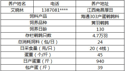 我叫艾晓林,在南昌厚田养4万多鹌鹑,搞养鹌鹑这条路有20年时间了,用海通饲料也用了两批了,与我以前养鹌鹑用的饲料比较起来,海通303蛋鹌鹑饲料我看还行!!!