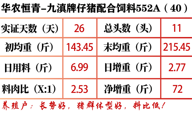 2022年12月17日,周老板称11头猪平均143.45斤(总初重1578斤),使用九滇牌仔猪配合饲料552A(40)喂养26天后,2023年1月12日,末均重215.45斤(总末重2370斤)。平均净增重72斤,平均日增重2.77斤,料肉比2.53。