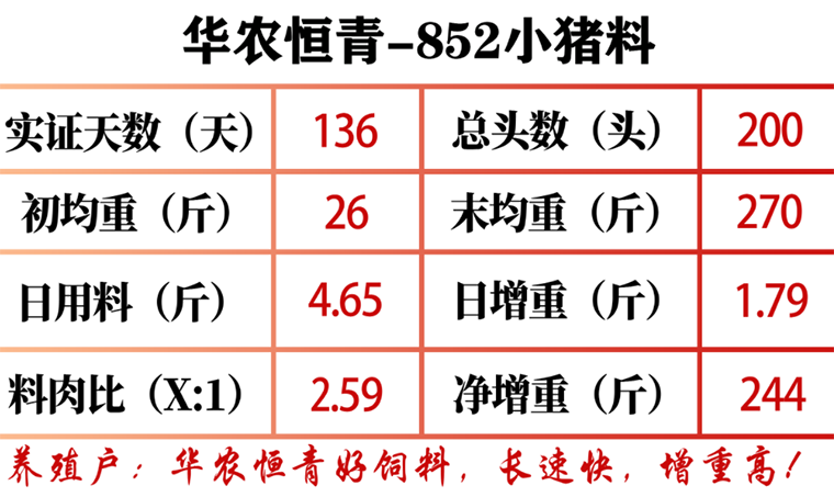 2022年7月2日,郭老板称200头仔猪平均26斤(总初重5200斤),使用华农恒青852小猪料喂养136天后,11月15日,末均重270斤(总末重54000斤)。平均净增重244斤,平均日增重1.79斤,料肉比2.59。