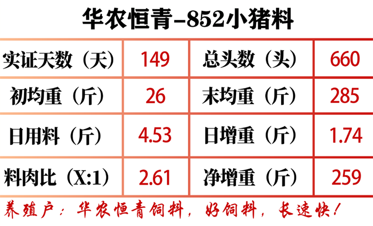 2022年7月2日,肖老板称660头仔猪平均26斤(总初重17160斤),使用华农恒青852小猪料喂养149天后,11月28日,末均重285斤(总末重188100斤)。平均净增重259斤,平均日增重1.74斤,料肉比2.61。