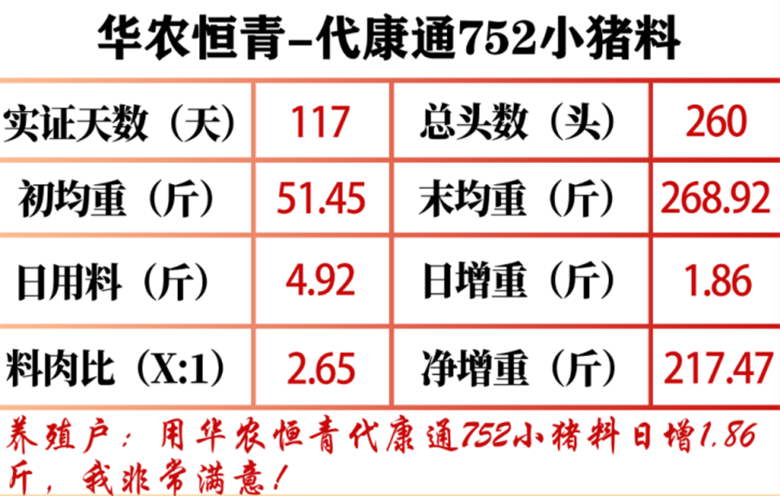 2022年9月21日,张老板称260头猪平均51.45斤(总初重13378斤),使用代康通752小猪料喂养117天后,2023年1月16日,末均重268.92斤(总末重69919.2斤)。平均净增重217.47斤,平均日增重1.86斤,料肉比2.65。