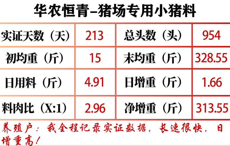 2022年5月26日,陆老板称954头仔猪平均15斤(总初重14310斤),使用华农恒青猪场专用小猪料喂养213天后,2023年1月3日,末均重328.55斤(总末重313440斤)。平均净增重313.55斤,平均日增重1.66斤,料肉比2.96。