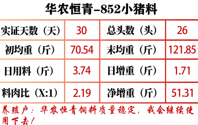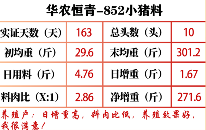“之前有短期的实证数据,这次记录了全程实证数据,猪只实际末重比我之前估算的多了十多斤,华农恒青852小猪料养殖效果非常棒,我对实证结果很满意!”